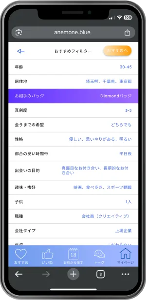 - 既婚者同士の不倫の出会いを目的としたマッチングアプリではございません。既婚者マッチングアプリAnemoneは公序良俗に反する行為は禁止とさせていただいており、ご利用者の方が不快に思う行為をされる方はご利用をお断りさせていただきます。