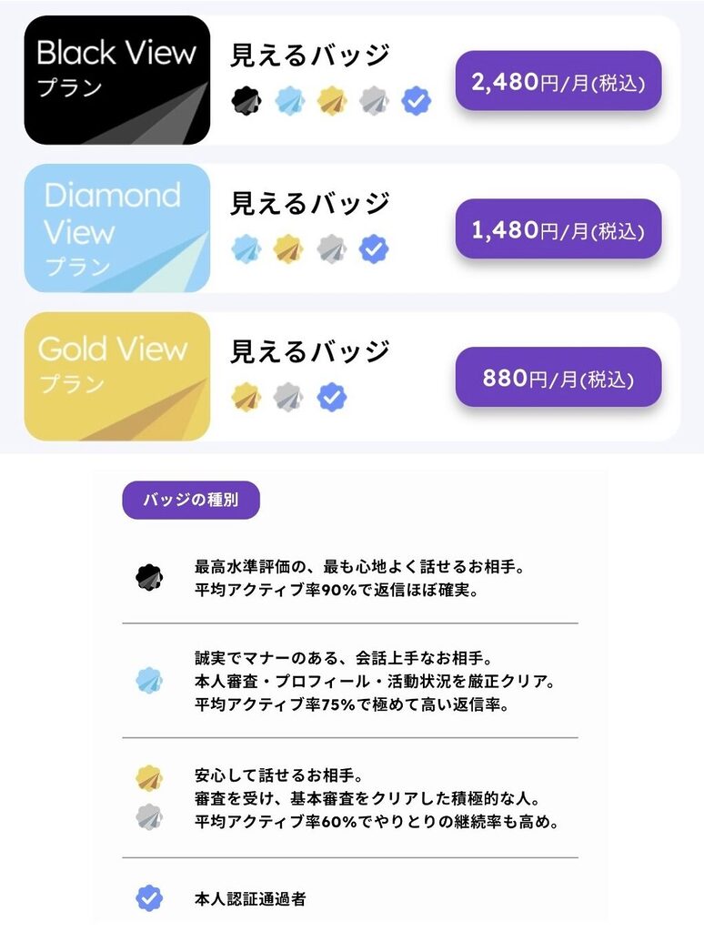 Vip View Optionは、バッジで信頼できるお相手が一目でわかるようになるオプションプランです。